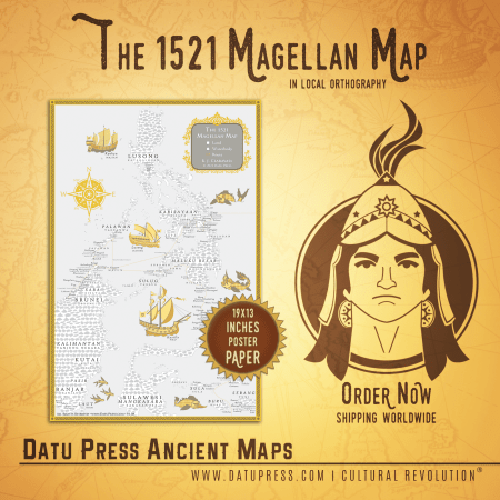 Datu Press® brings you the 1521 Magellan Map, featuring the route, places, islands, navigational markers, reefs, peoples, and significant Malayan kingdoms described and mentioned by the chroniclers of the Magellan Expedition — all in decolonized, Malayan, local orthography, for only ₱700.00 PHP + shipping fee.